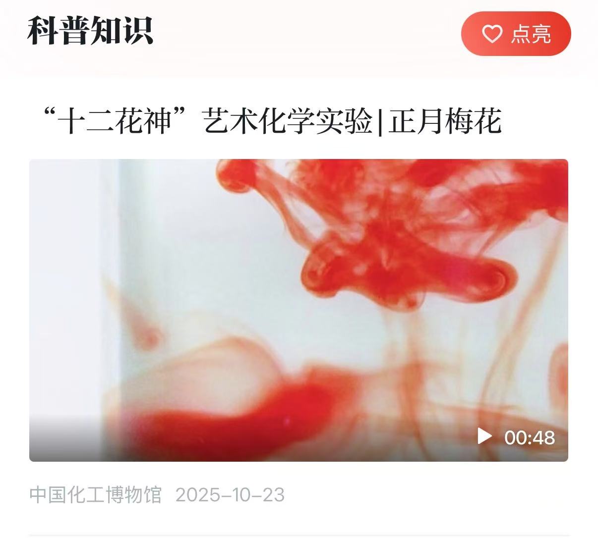 由我馆自主策划的“十二花神”艺术化学实验项目以专题形式荣登“学习强国”平台。项目将传统文化与现代化学实验巧妙融合,通过化学实验还原花卉的缤纷色彩与绽放形态,让科学绽放古典美学之光。这次破圈,是对化博创新实践的肯定。