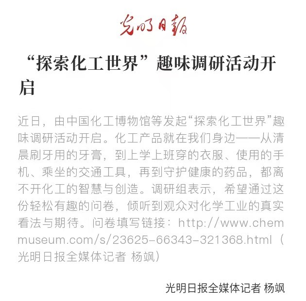 “探索化工世界”趣味调研活动在《光明日报》开启。本次活动由化博发起,旨在以轻松有趣的问卷形式,倾听公众对化学工业的真实认知与期待。从清晨刷牙用的牙膏,到上学上班穿的衣服、使用的手机、乘坐的交通工具,再到守护健康的药品,都离不开化工的智慧与创造,本次活动希望以轻松互动的方式,引导公众重新发现化工与日常生活的紧密联结,共同展望其未来发展的更多可能。