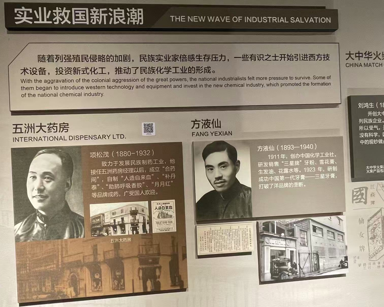 在外国资本经营区,展示着英美商行的“洋火”“洋碱”,以示他们最初的垄断。讲解员的语调变得激昂起来。相邻的展板上则罗列着早期中国化工企业的名单,其中有创办于1892年的太原火柴厂(局),可见地处黄土高原内陆的家乡,在近代化进程中不算落伍。